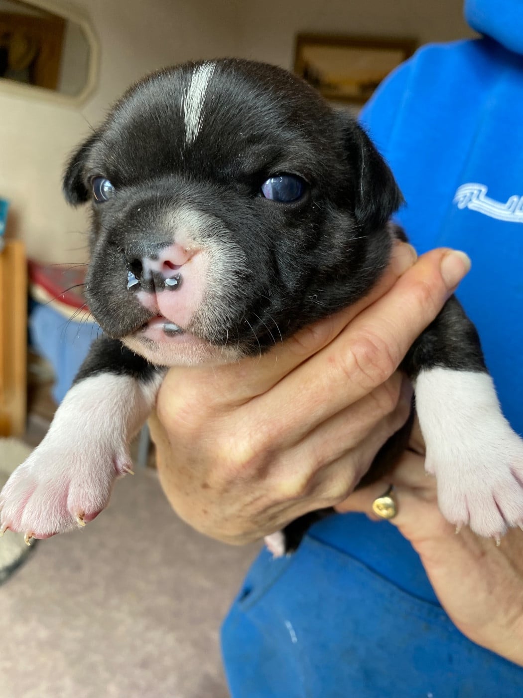 Chiot bringé noir avec une ligne blanche sur la tête, du blanc autour du cou, sur la poitrine et le ventre, et quatre pattes blanches.